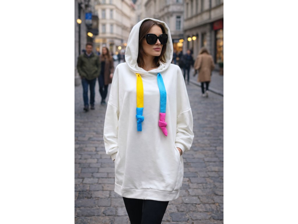 Dominantním prvkem jsou barevné šňůry s uzlem, které dodávají mikině hravý, moderní charakter. Díky oversize střihu krásně sedí různým typům postavy a poskytuje maximální komfort při nošení.